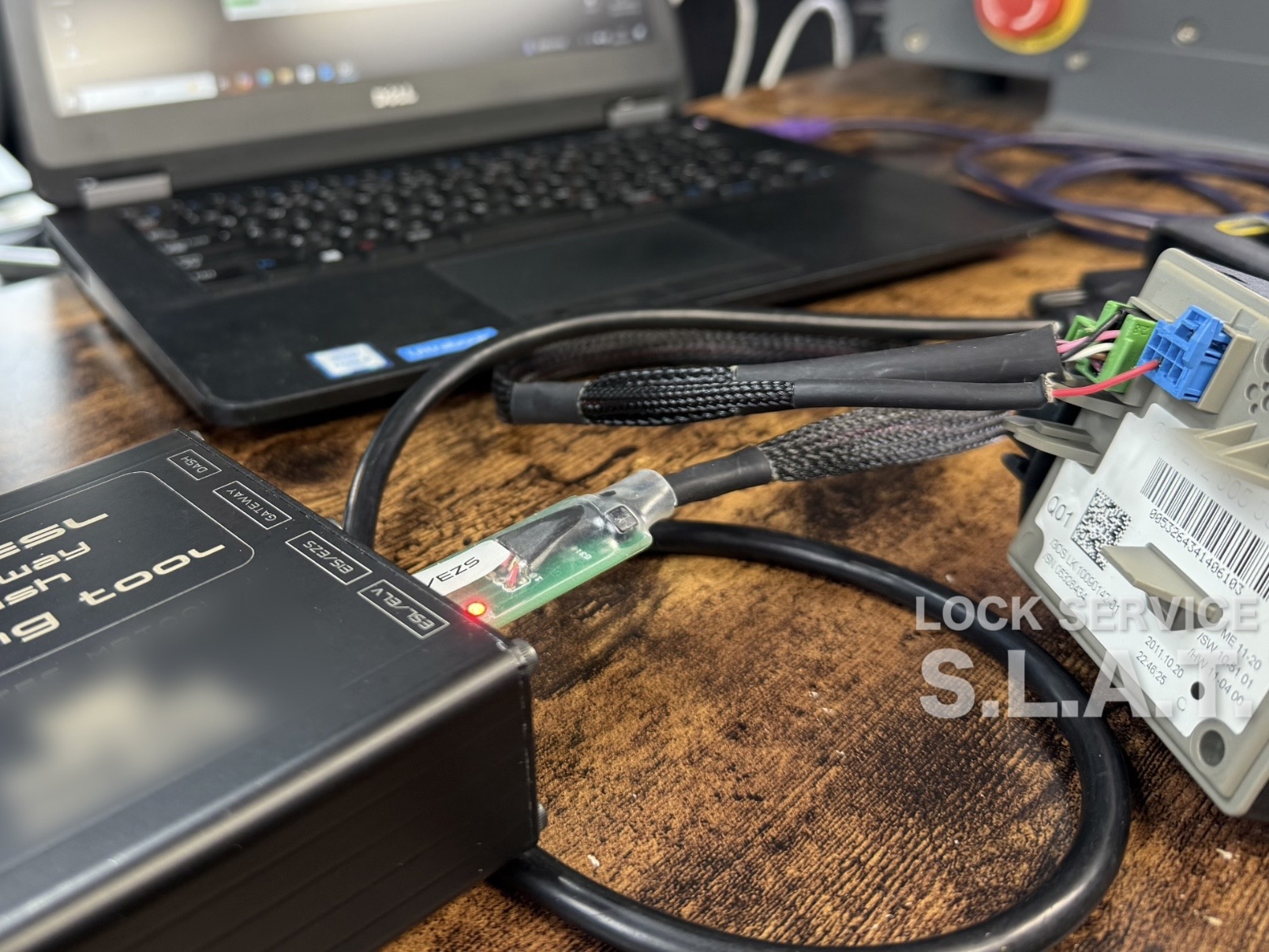 最後にW218(右ハンドル)の鍵作成したのは1年前だったので、遠い記憶を頼りにベンチテスト用の機材に接続してあれこれ作業。