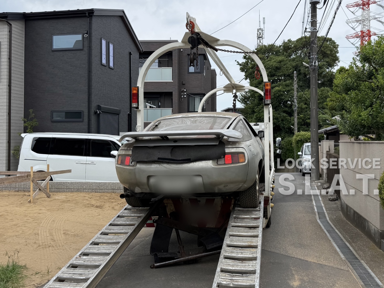 目の前の道幅が狭く、両サイドの壁と柱が邪魔でウインチで引き出せないとのこと。