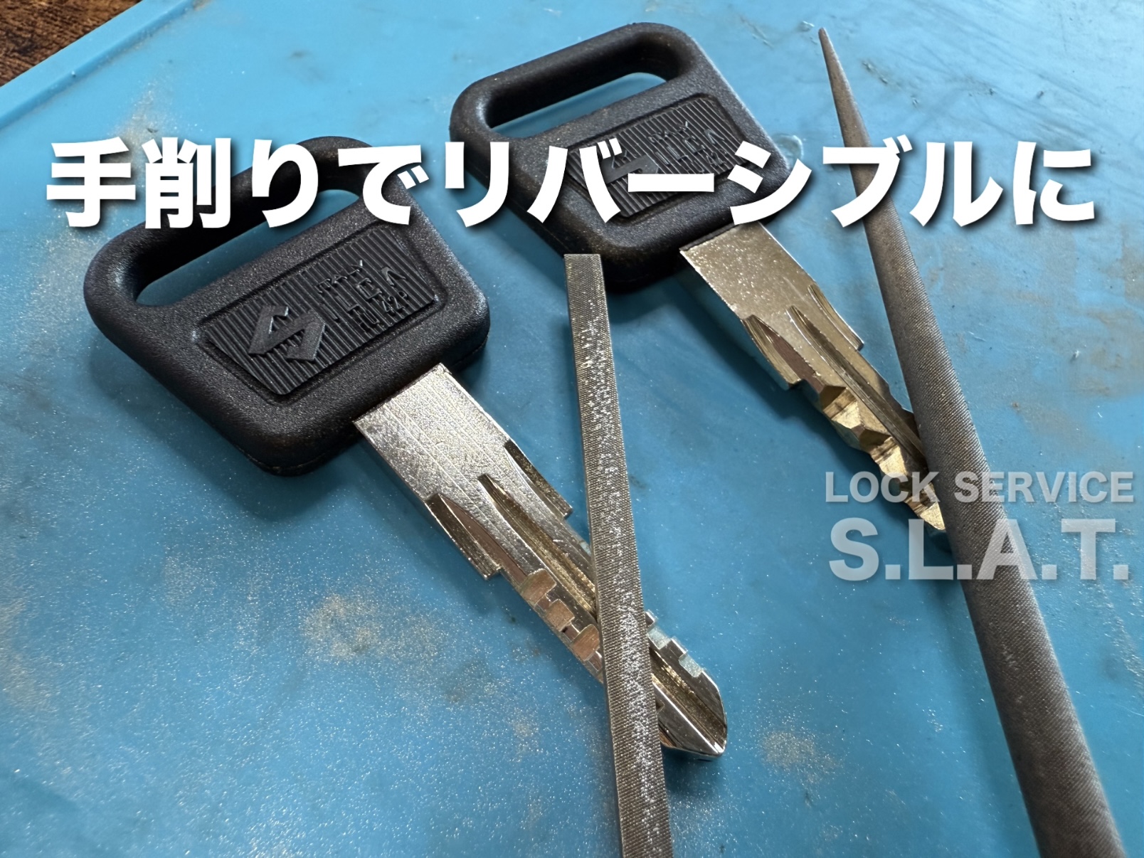 しばらく車屋さんと世間話をして、車屋さんが私用で出かけている間にシャコシャコと鍵をヤスってリバーシブルに仕上げていきます。