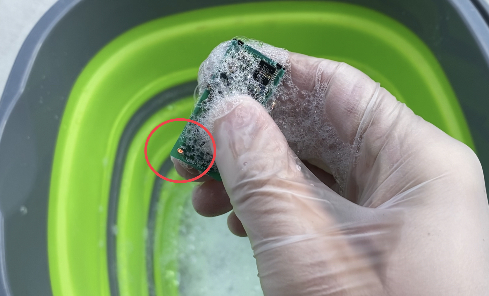 本来ならケースの中に収まっている基板ですがダイレクトに浸します。約10分間浸した後に動作チェックを行います。